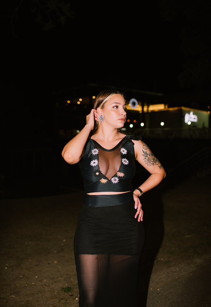 Pollera "Carole" ( Pollera larga entera en Tul con recortes en los costados y una falda mini en tela de forro en el interior)